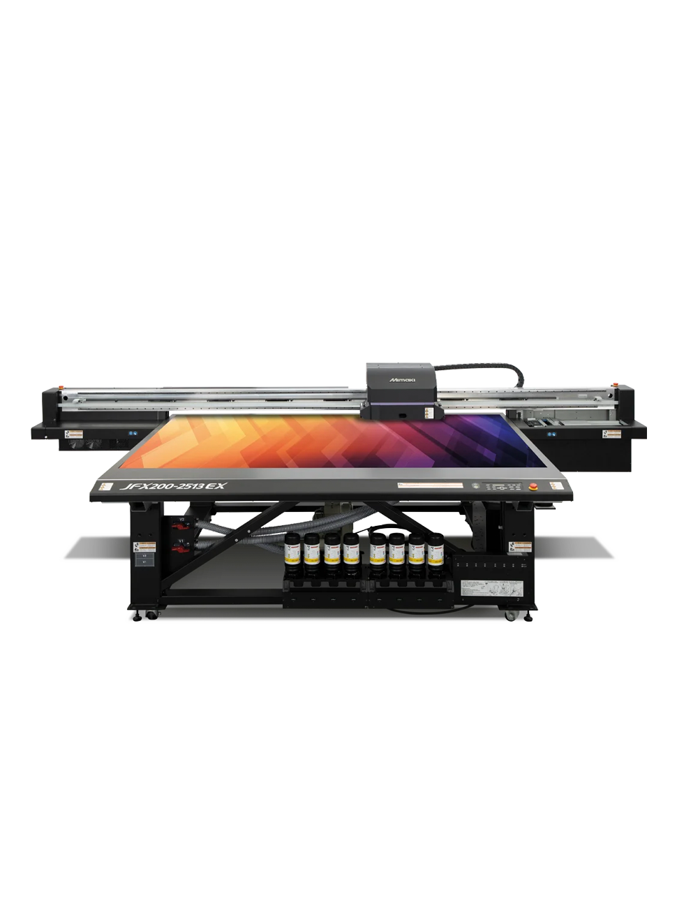 The Mimaki JFX200-2513 EX UV Flatbed Printer delivers high-speed, high-quality printing on rigid media, including white ink output at up to 35 m²/h. Featuring 2.5D Texture Maker technology, it enables eye-catching textures and creative effects while maximizing production efficiency and profitability.
